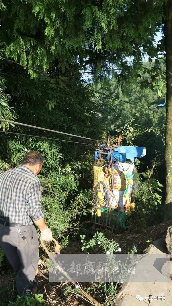 除了运送物资,索道还要承担载人的任务。有时候,唐明生骑着摩托车到达垭口,会打电话通知在山顶家中的妻子,启动电机,他自己爬进索道上的一个斗车(工地上装混泥土的推车)里,两分钟就到达山顶。2015年,唐花3000多元从成都买回遥控设备安装在索道上,自己在下面爬上斗车,只需启动手里的遥控开关,位于山顶的电机自动启动,索道载着他徐徐向山上爬行,到终点时,再按下停止键,斗车便停下来。但前不久,遥控设备遭雷击损害。