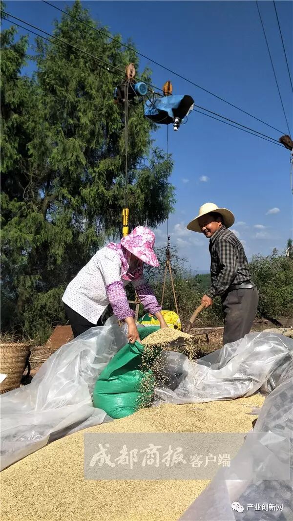 下午3点,火辣的太阳炙烤着摊在公路上的稻谷。唐明生带着一顶草帽,催促妻子拿扫帚、耙子将稻谷收拢装袋。毕竟,要将2000多斤稻谷全部运到山顶,不是一件容易的事。即便现在通过他自制的索道比以前要节约一大半时间,但索道运转一个来回也需要10分钟左右时间。