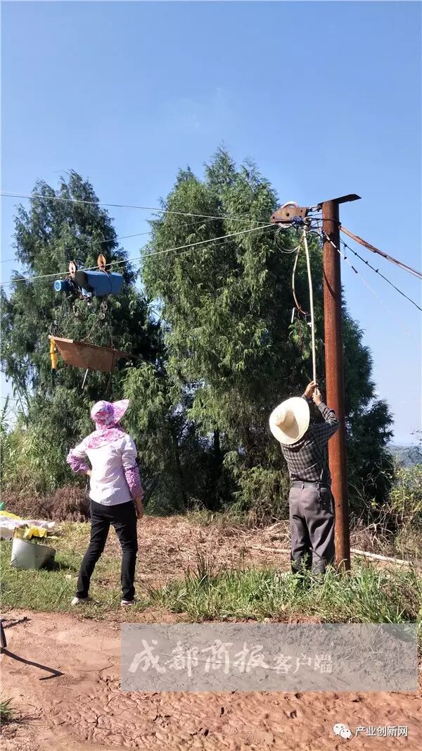 一辆带轮的小推车,被唐明生绑上粗实的麻绳。他撑竹竿取下挂在索道上的电源线,插上电源,启动升降开关,分别被滑轮挂在主钢丝绳上的两台电机缓缓转动,垂直放下两个挂钩落在地上。绑着推车的麻绳,就挂在两个挂钩上。装好袋的600余斤稻谷随后被搬到推车上,系上绳子。启动升降开关,装满稻谷的推车就被高高挂在离地三四米高的索道钢丝绳上。