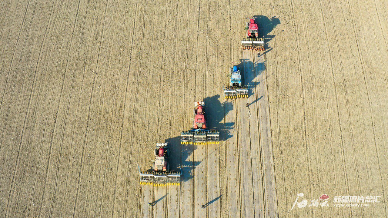 大家伙、大动静、大场面,从牵引打药到犁地耕地,从整地耙地到精量播种,五花八门的大马力耕作机械轰鸣响彻沃野。搭载导航自动驾驶系统的精量播种机,作业精准高效,一行行一片片,从空中俯瞰棉田,俨然一幅工笔画,画面极为“治愈”。